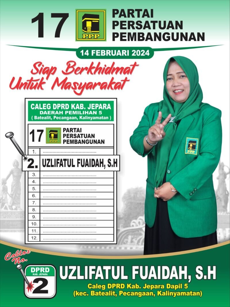 “Insyaallah, tahun 2024 akan kembali maju sebagai calon legislatif DPRD Jepara dari PPP, dengan nomor urut : 2 di daerah pemilihan (Dapil) V Jepara, yaitu Batealit, Pecangaan dan Kecamatan Kalinyamatan “, ujar Uzlifatul Fuaidah, SH.