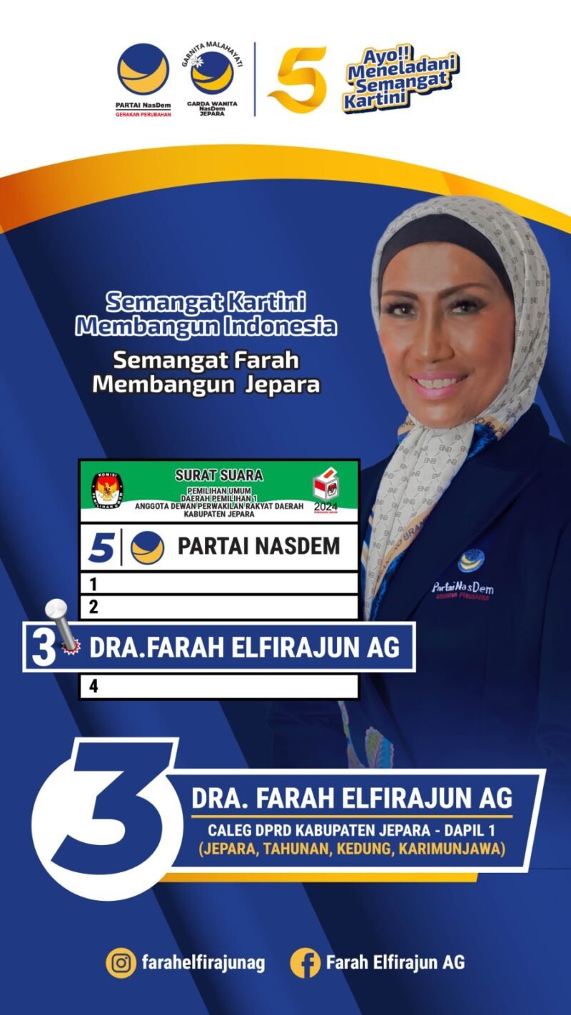 Lensapolri.com, Jepara — DRA. Farah Elfirajun AG adalah salah satu calon legislatif DPRD Kabupaten Jepara tahun 2024, dari Partai Nasional Demokrat atau biasa disebut dengan (Nasdem). Dengan nomor urut : 3 yang akan maju di daerah pemilihan (Dapil I) Kecamatan Jepara, Tahunan, Kedung dan Kecamatan Karimunjawa.