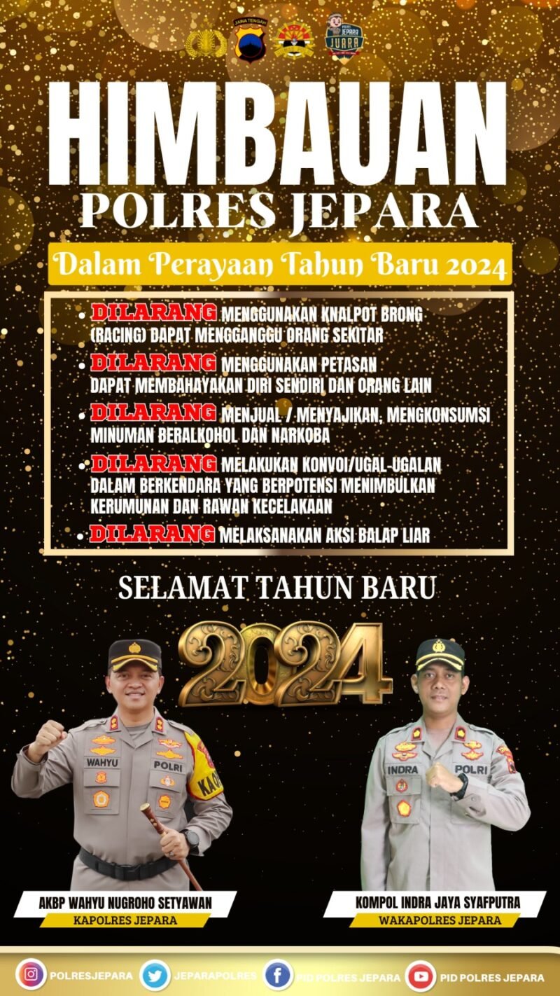 Adapun sejumlah imbauan kamtibmas dari Kapolres Jepara antara lain meminta masyarakat agar selama menyambut tahun baru 2024, tidak membunyikan mercon dan lainya yang dapat mengganggu ketenangan umat beribadah.