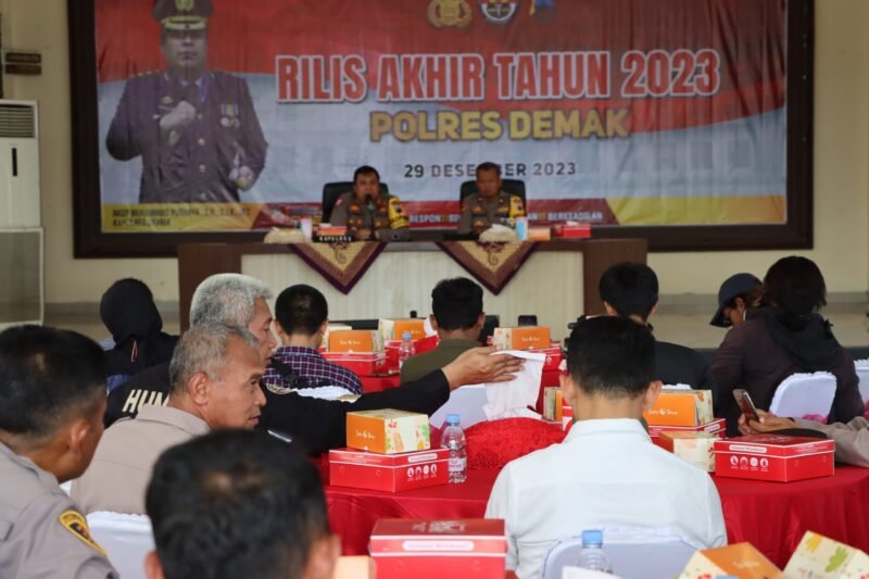 Lensapolri.com, Demak — Kepala Kepolisian Resor Demak AKBP Muhammad Purbaya didampingi Kabag Operasional Kompol Sonhaji dan PJU Polres Demak menyampaikan Rilis Akhir Tahun 2023 di Pendopo Parama Satwika Polres Demak, Jum’at (29/12/2023).