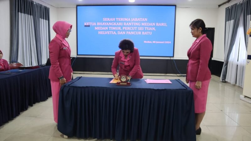 Ketua Bhayangkari Polrestabes Medan Ny Ulivia Teddy Marbun menggelar serah terima jabatan pengurus dan Ketua Ranting Cabang Bhayangkari Polrestabes Medan di Gedung Patriatama Polrestabes Jalan HM Said Medan, Senin (8/1/2024).