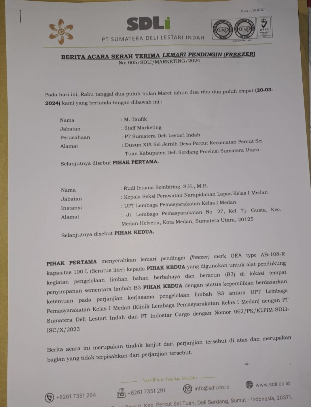Penerimaan freezer itu berstatus kepemilikan yang berdasarkan ketentuan pada perjanjian kerjasama pengelolaan limbah B3 antara UPT Lapas I Medan (Klinik Lapas I Medan) dengan PT SDI dan PT Indostar Cargo, dengan Nomor 062/ PK/ KLPIM – SDLI- ISC/ X/ 2023.(red)