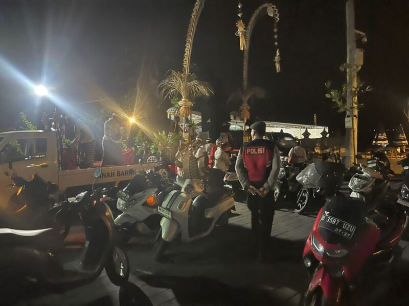 Kuta Utara – Untuk memberikan rasa aman dan nyaman kepada umat Hindu yang melaksanakan persembahyangan, Unit Samapta Polsek Kuta Utara melakukan pengamanan dikawasan di areal Pura Batu Mejan, Kecamatan Kuta Utara, Kabupaten Badung. Minggu (17/11/2024) pukul 21.00 wita.