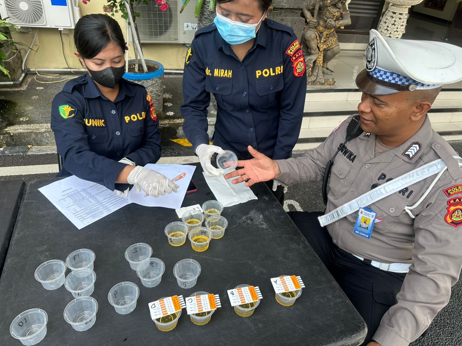 Puluhan personel yang dicek urinenya itu diambil secara acak setelah mengikuti apel pagi yang dipimpin langsung oleh Kapolres Badung AKBP Teguh Priyo Wasono didampingi Wakapolres Badung Kompol I Made Pramasetia, S.H., S.I.K., M.H beserta PJU Polres Badung. Pemeriksaan itu dilakukan oleh tim Dokkes Polres Badung yang dipimpin Kasi Dokkes Iptu dr Pande Mirah Dwi Anggreni, M.A.R.S bersama dengan dua anggotanya dan diawasi oleh Sipropam Polres Badung.