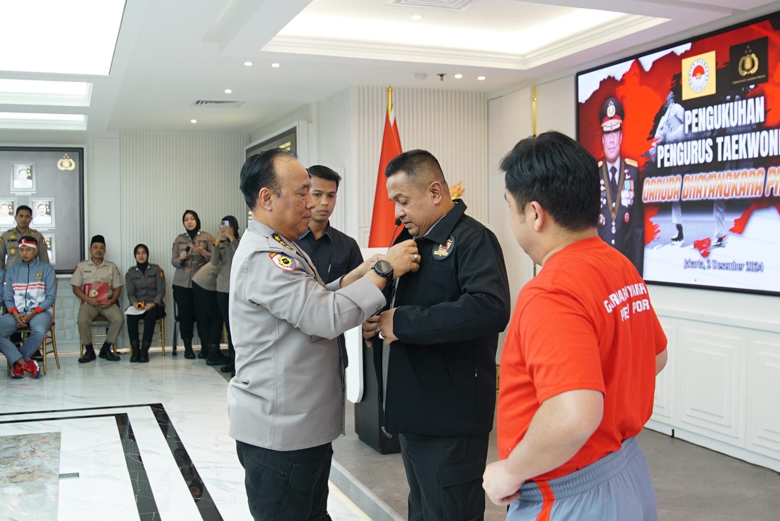Irwasum Polri Komjen Pol Dedi Prasetyo mengukuhkan dan melantik Pengurus Besar Taekwondo Indonesia Garbha Presisi, Senin (02/12/2024) di Jakarta.