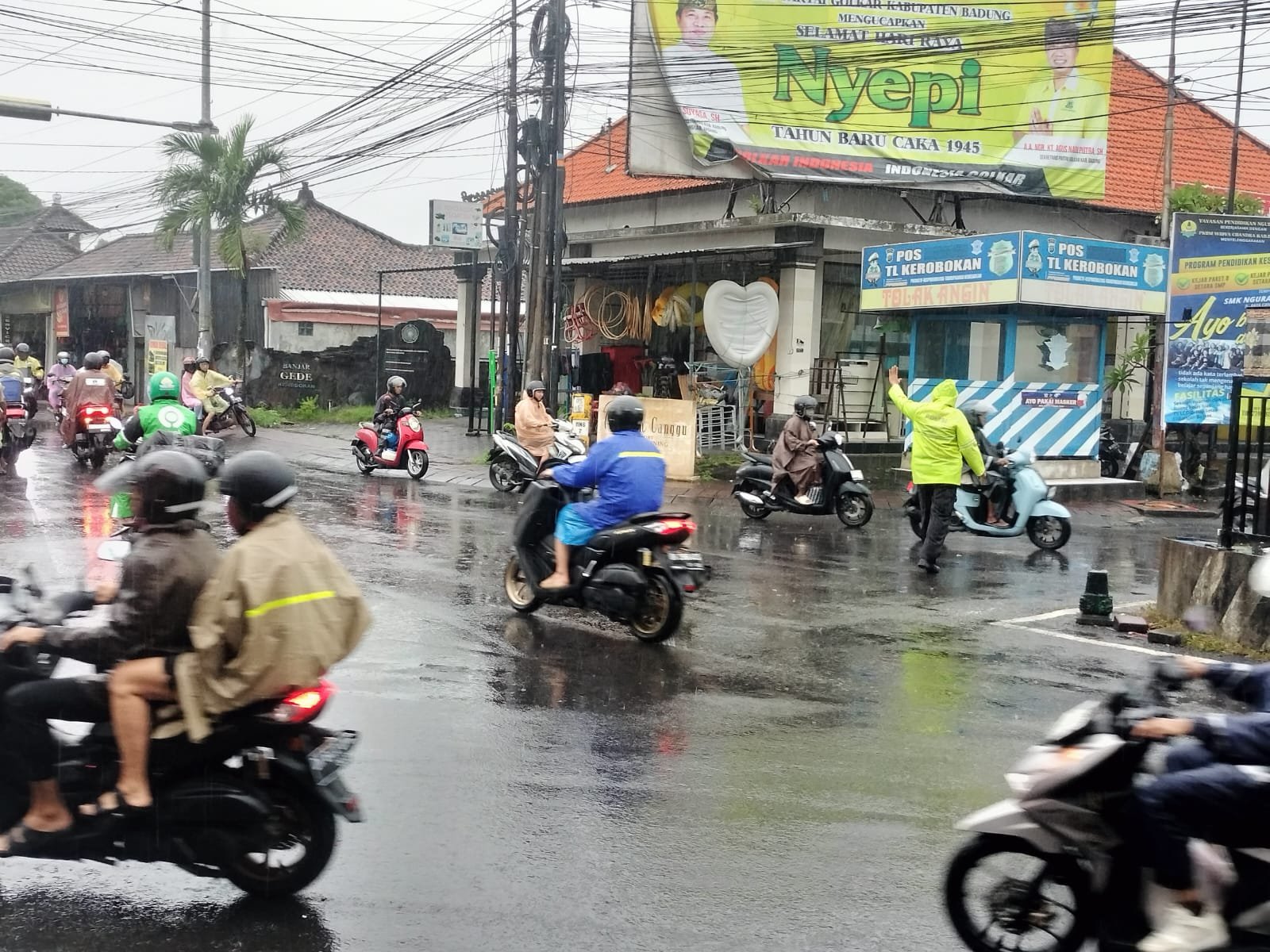 Tampak dilapangan dengan berseragam lengkap dan memakai jas hujan, petugas lalu lintas Polsek Kuta Utara tidak mempedulikan hujan, tetap sibuk mengatur lalu lintas di titik-titik lokasi jalan yang sering macet di sepanjang jalan raya Canggu. Senin (16/12/2024) sore.
