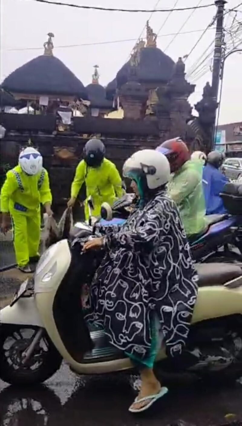 Untuk meminimalisir kemacetan dan kecelakaan lalu lintas ditengah cuaca hujan nampak dua personel Lalu Lintas Polsek Kuta Utara yakni Panit 2 Unit Lantas Ipda I Made Sutarja dan Bripka I Made Surya Prayoga bergerak cepat untuk menutup (mengurug) jalan berlubang tersebut dengan menggunakan material tanah yang ada disekitar lokasi.