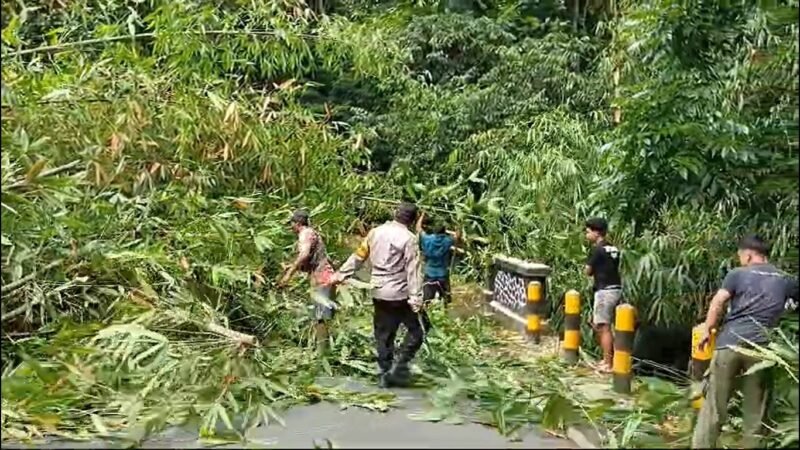 Mangupura – Memasuki musim hujan situasi cuaca terkadang extrim hujan dengan intensitas tinggi disertai angin kencang berpotensi terjadi bencana alam seperti tanah longsor dan pohon tumbang. Bhabinkamtibmas Desa Sulangai Aiptu I Gede Muliarta bersama warga melakukan evakuasi pohon tumbang jenis pohon bambu yang menutupi akses Jalan arah menuju Pura Puncak Tedung di Br. Batulantang, Desa Sulangai, Kec. Petang,yang di akibatkan oleh Angin Kencang, Selasa, 24/12/24.