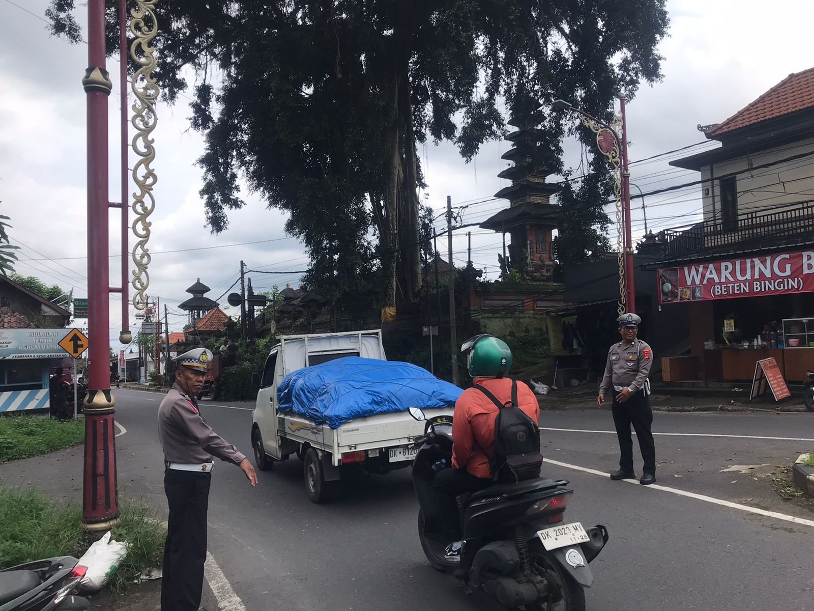 Pada kesempatan Kanit Lantas bersama Anggota dan Bhabinkamtibmas Aiptu I Nyoman Dama berkalaborasi dengan Pecalang melaksanakan pengamanan dan pengaturan arus lalulintas dengan sistem buka turup atensi kegiatan pemotongan dahan Pohon Beringin oleh warga Desa Adat Bebalang, “sehingga tidak mengganggu kenyamanan pengguna jalan dan arus lalu lintas.” Ujarnya
