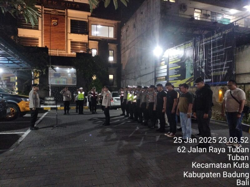Kuta, Lensapolri.com – 25 Januari 2025 – Polsek Kuta melaksanakan Apel Atensi Malam Minggu pada hari Sabtu malam pukul 23.00 WITA di halaman Mako Kuta, yang dipimpin langsung oleh Kapolsek Kuta, AKP Agus Riyawanto Diputra, S.I.K., M.H., dan diikuti oleh 32 personel.