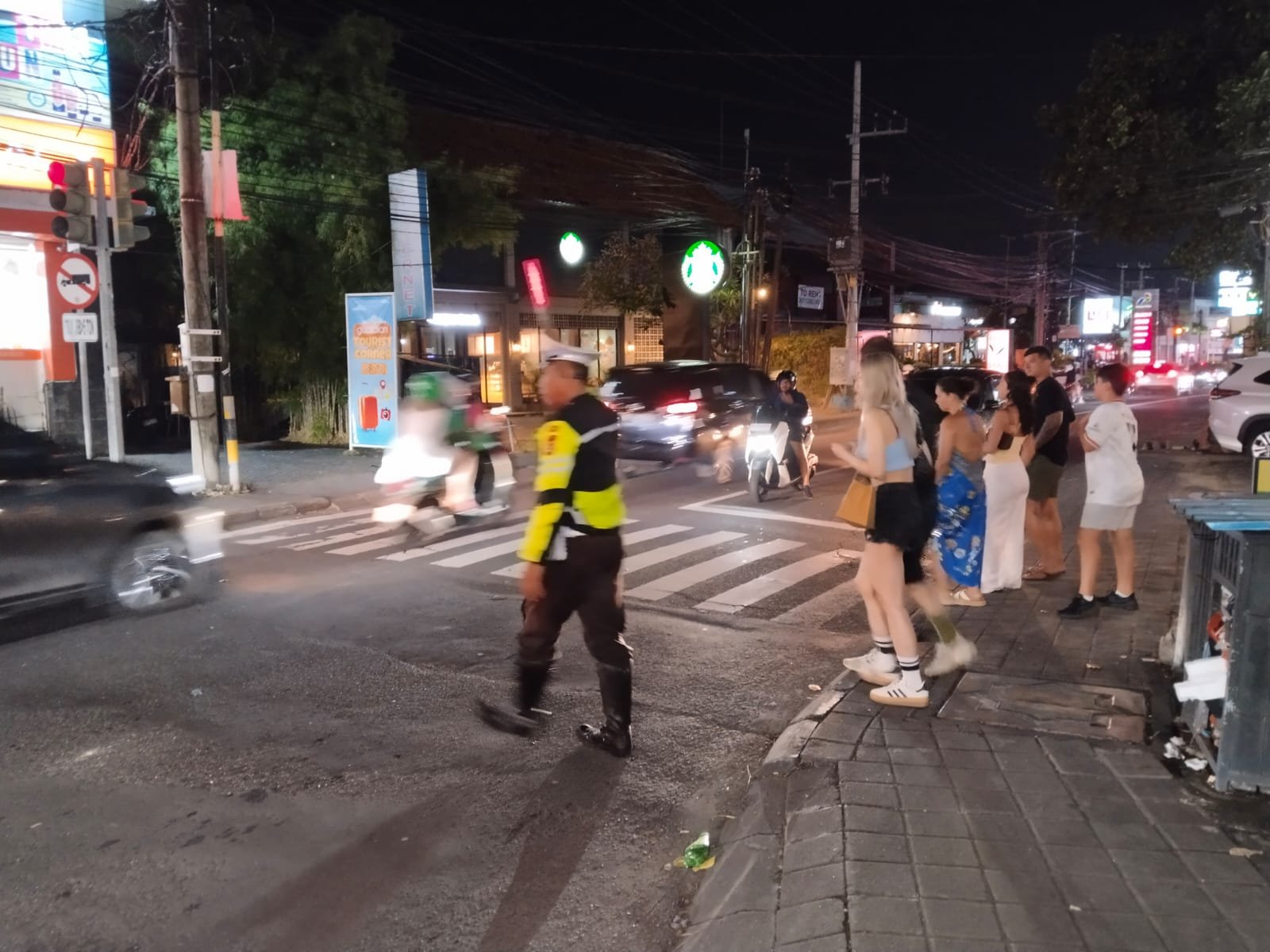 Terlihat saat mengurai kepadatan arus lalu lintas Personil Unit Lalu Lintas Polsek Kuta Utara membantu pejalan kaki menyebrang jalan di simpang Lio Square Kelurahan Kerobokan Kelod, Kecamatan Kuta Utara, Kabupaten Badung. Selasa (28/1/2025) pukul 21.00 Wita.