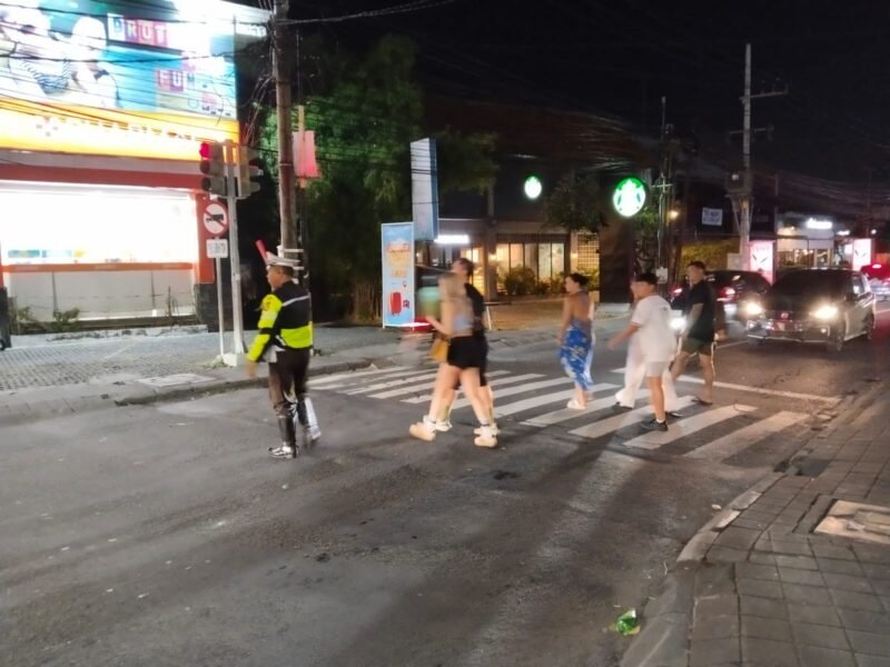Terlihat saat mengurai kepadatan arus lalu lintas Personil Unit Lalu Lintas Polsek Kuta Utara membantu pejalan kaki menyebrang jalan di simpang Lio Square Kelurahan Kerobokan Kelod, Kecamatan Kuta Utara, Kabupaten Badung. Selasa (28/1/2025) pukul 21.00 Wita.