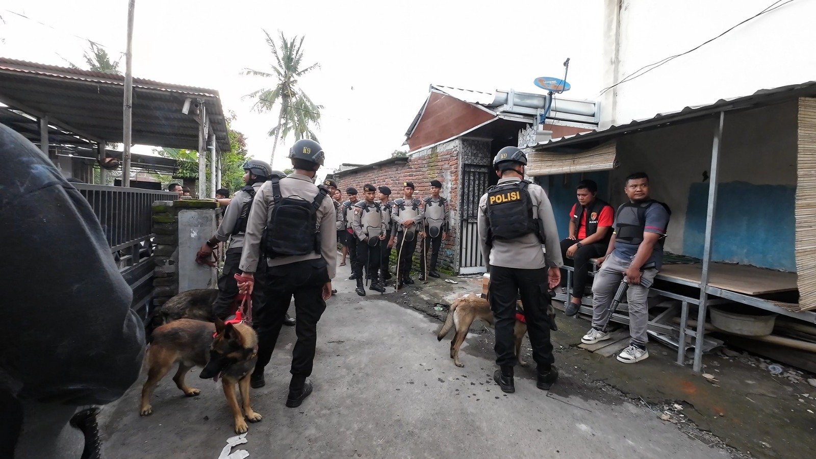 Enam personel Polsatwa beserta 3 ekor anjing pelacak khusus (Caksus) narkoba atau K-9 diturunkan untuk melakukan pencarian barang bukti barang haram perusak anak bangsa di kampung tersebut.
