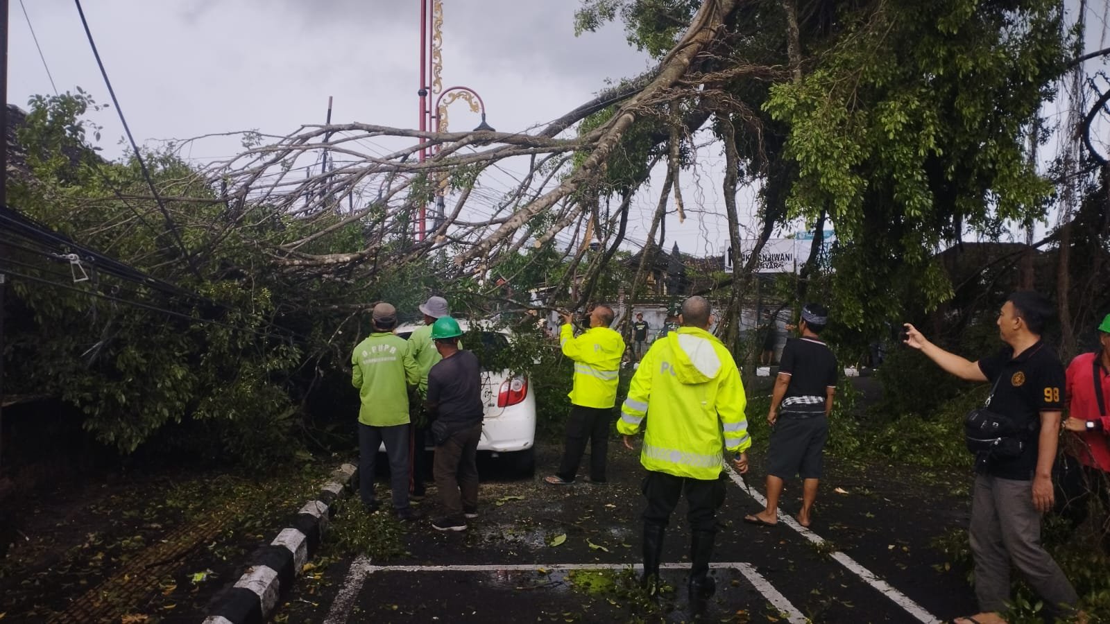 Dahan pohon yang patah melintang menutup akses jalan, menimpa kabel listrik, atap bangunan rumah, dan satu unit mobil Toyota Agya DK 1922 BL.