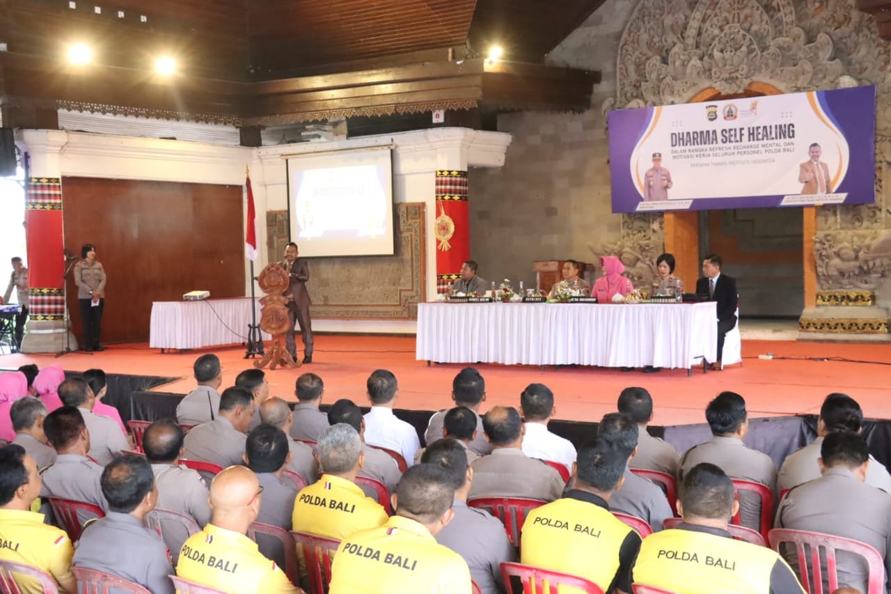 GIANYAR – Lensapolri.com – Program Kapolda Bali bertajuk “Dharma Self Healing” sukses digelar di Balai Budaya Gianyar pada Senin, 10 Februari 2025, pukul 08.30 hingga 11.10 WITA. Kegiatan ini bertujuan untuk merefresh dan menguatkan mental serta motivasi kerja seluruh personel Polda Bali, bekerja sama dengan Thanks Institute Indonesia. Acara ini dihadiri oleh berbagai pejabat dan personel Polres Gianyar, termasuk Kapolres Gianyar AKBP Umar, S.I.K., M.H., serta Ketua Bhayangkari Cabang Gianyar Ny. Elisa Umar beserta pengurus dan anggota.