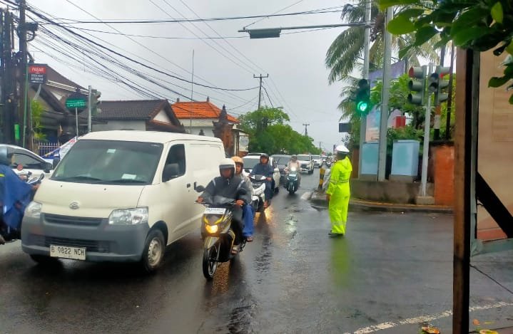 Hujan yang mengguyur wilayah Denpasar Timur pada pagi hari tidak menyurutkan semangat personil Unit Lalu Lintas Polsek Denpasar Timur (Dentim) untuk tetap menjalankan tugasnya mengatur arus lalu lintas di sejumlah titik rawan kepadatan, Senin (10/02/2025) pagi.