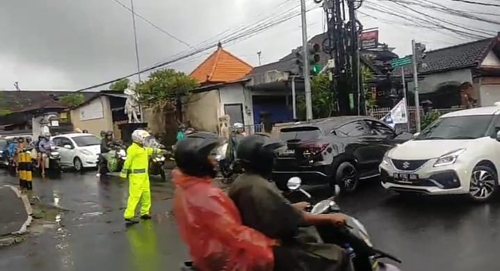 Hujan yang mengguyur wilayah Denpasar Timur pada pagi hari tidak menyurutkan semangat personil Unit Lalu Lintas Polsek Denpasar Timur (Dentim) untuk tetap menjalankan tugasnya mengatur arus lalu lintas di sejumlah titik rawan kepadatan, Senin (10/02/2025) pagi.
