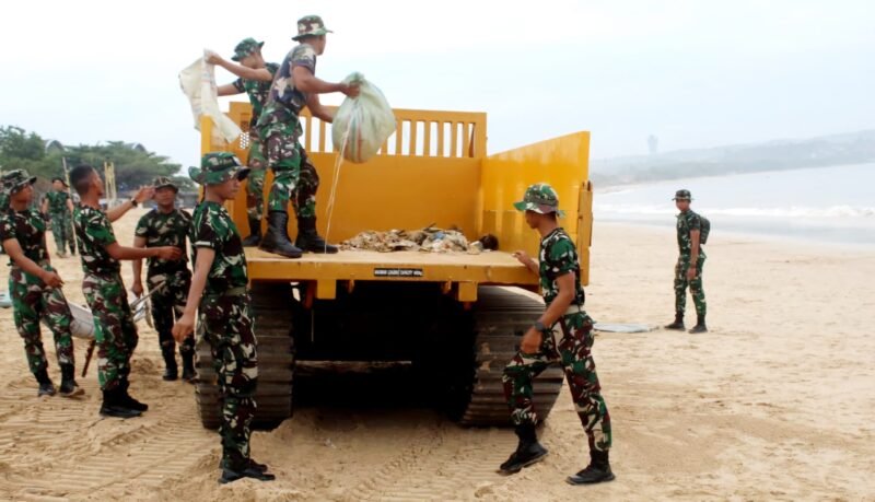 BADUNG, Lensapolri.com – Tentara Nasional Indonesia (TNI) bersama Dinas Lingkungan Hidup dan Kebersihan (DLHK) menggelar karya bakti terpadu pembersihan sampah di pesisir pantai Kuta dan Pantai Kedonganan. Kegiatan diikuti oleh ratusan personel TNI dan DLHK serta Desa adat dan warga setempat. Badung, Bali. Senin, (10/02/2025)