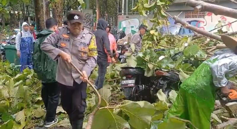 “Ini bagian dari upaya penanganan bencana alam, melalui UKL Kami hadir bersama sama dengan warga bergotong royong membersihkan material pohon tumbang sehingga tidak menghalangi aktifitas masyarakat,” Ucap Kapolsek.