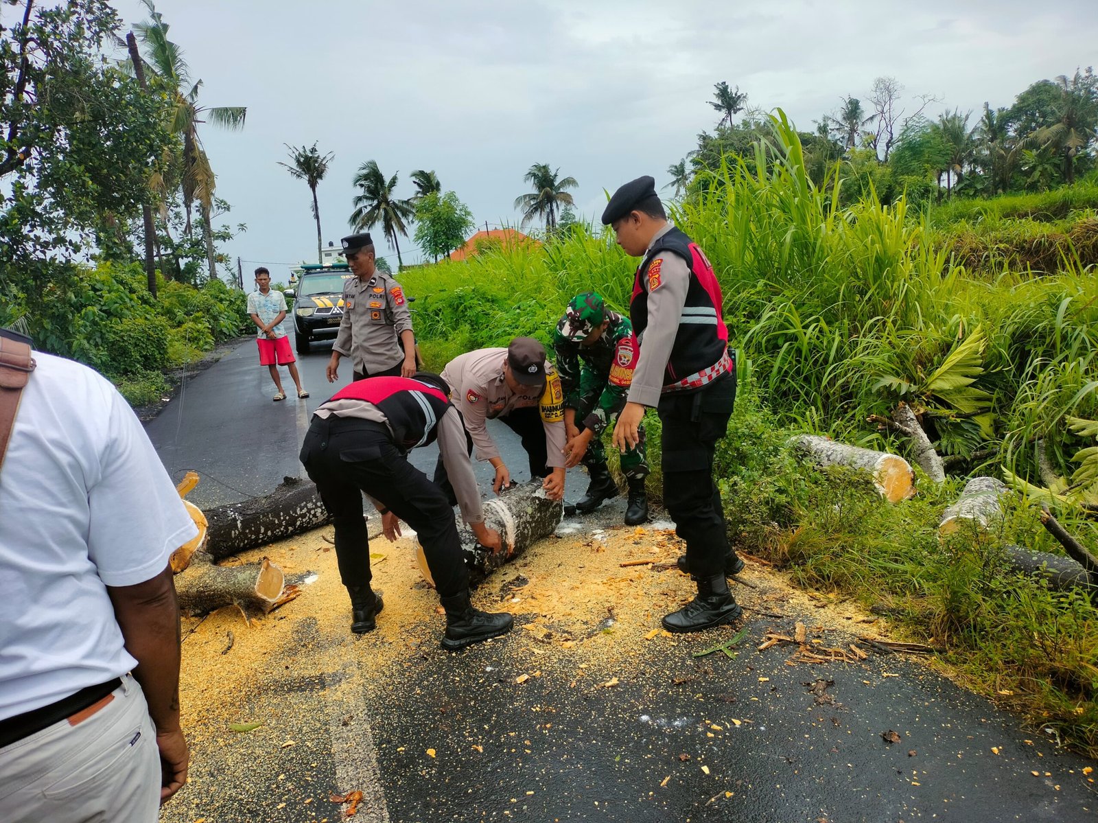 Menanggapi situasi tersebut, Polsek Blahbatuh segera melakukan koordinasi dengan berbagai pihak terkait, termasuk Babinsa, Bhabinkamtibmas, Pemerintah Desa Pering, dan masyarakat setempat. Bersama-sama, mereka bergerak cepat untuk melakukan pembersihan dan pemotongan pohon tumbang guna membuka kembali akses jalan yang sempat terhalang.
