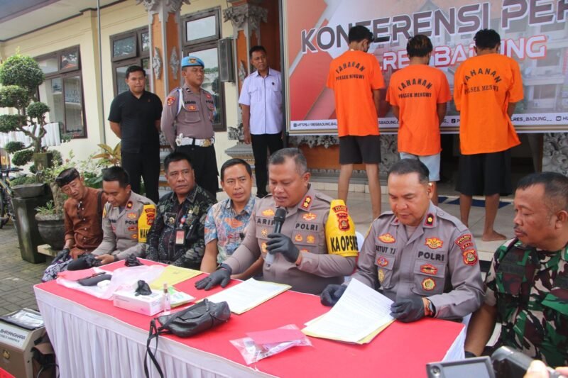 Kapolres Badung AKBP M. Arif Batubara, SH, SIK, MH, M.Tr.Opsla, didampingi Waka Polres Badung Kompol I Made Pramasetia, S.H., S.I.K, M.H., Danramil Mengwi 1611/04 Mengwi Mayor Kav. I Ketut Darmawan, Kapolsek Mengwi Kompol I Ketut Adnyana, Kasatresnarkoba AKP I Nyoman Sudarma S.H., M.H., Kanit Reskrim Polsek Mengwi AKP I Komang Juniawan, S.H., M.H., Kasipropam Res Badung AKP I Nyoman Sutanaya, SH dan Ps. Kasihumas Ipda I Putu Sukarma serta menggandeng Forkopimcam Mengwi, membeberkan hasil pengungkapan dalam konferensi pers di Lobby Polsek Mengwi Jalan I Gusti Ngurah Rai 110, Banjar Denkayu Delodan, Desa Werdi Bhuwana, Kecamatan Mengwi, Kabupaten Badung, Bali, Selasa (18/2/25 ).