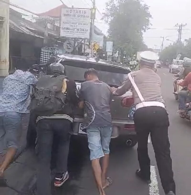 Mobil yang mogok kemudian didorong oleh anggota Lantas Aiptu Ketut Suarjana dibantu warga setempat sehingga mesin yang mogok dapat hidup kembali.