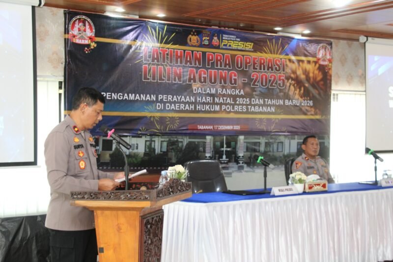 Lensapolri.com – TABANAN – Dalam rangka memastikan kesiapan personel menjelang perayaan Natal 2025 dan Tahun Baru 2026, Polres Tabanan menggelar Latihan Pra Operasi (Latpraops) Kepolisian Terpusat Operasi Lilin Agung–2025. Kegiatan ini berlangsung pada Rabu, 17 Desember 2025, pukul 09.00 hingga 11.30 Wita, bertempat di Aula Wisnu Hartono Polres Tabanan.
