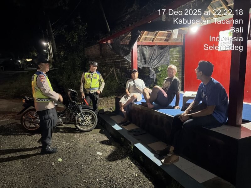 Lensapolri.com – Polres Tabanan – Polsek Selemadeg. Guna menjamin keamanan wilayah, Polsek Selemadeg yang dipimpin Pawas Aiptu Agus Purwanto, S.H. beserta tiga personel melaksanakan Patroli Blue Light dan Barcode pada Rabu (17/12/2025) malam. Menggunakan unit mobil 902, petugas menyisir area pemukiman, pusat perbelanjaan, tempat ibadah, perbankan, SPBU, hingga jalur utama Denpasar-Gilimanuk untuk mencegah aksi kriminalitas 3C, balap liar dan antisipasi kecelakaan lalu lintas.