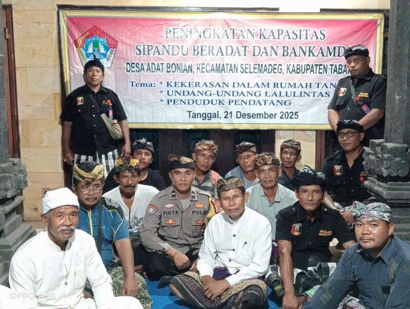 Lensapolri.com – Polres Tabanan – Polsek Selemadeg melalui Bhabinkamtibmas Desa Antap Aipda I Komang Tirtayasa, S.H., mewakili Kapolsek Selemadeg, menghadiri kegiatan peningkatan kapasitas Sipandu Beradat dan Bakamda di Desa Adat Bonian, Tabanan, Minggu (21/12/2025) malam. Acara yang dihadiri Majelis Alit dan tokoh adat setempat ini bertujuan mempererat koordinasi keamanan berbasis kearifan lokal.