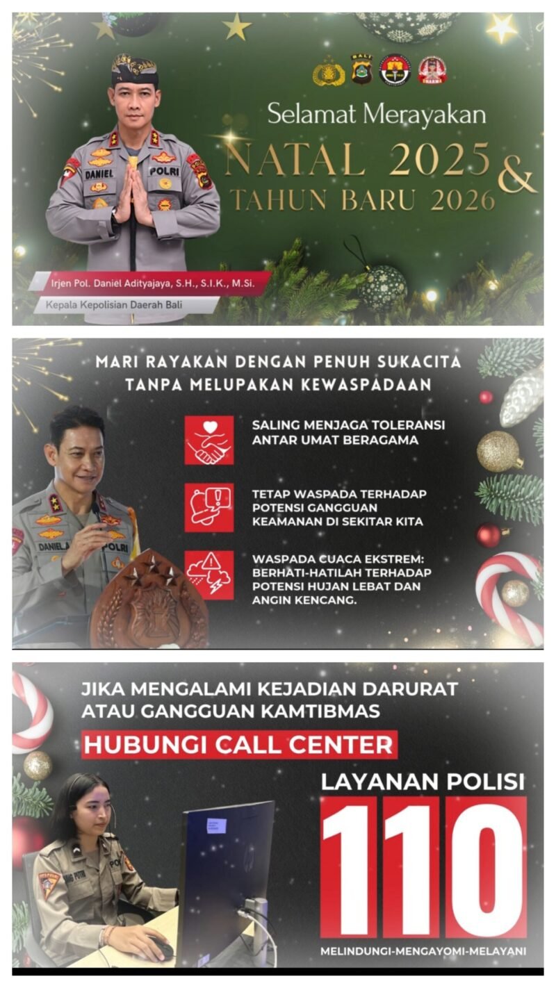 Lensapolri.com – DENPASAR.,Dalam momentum perayaan Hari Raya Natal dan menyambut Tahun Baru, Kepala Kepolisian Daerah Bali Irjen Pol. Daniel Adityajaya menyampaikan ucapan selamat kepada seluruh masyarakat Bali serta umat Kristiani yang merayakan Natal. Ia mengajak seluruh elemen masyarakat untuk merayakan hari besar keagamaan dengan penuh sukacita, kedamaian, dan rasa syukur, tanpa melupakan pentingnya kewaspadaan dan kepedulian bersama.