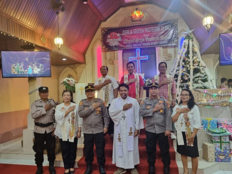 Lensapolri.com – Polres Tabanan-Polsek Kerambitan, Rabu 24 Desember 2025; Kapolsek Kerambitan AKP PUTU BUDIAWAN bersama 8 orang Personel tersprin laksanakan Pengamanan Ibadah Malam Kudus dan Perayaan Natal di GKPB Jemaat Suluh Kasih Tibubiu-Kerambitan.