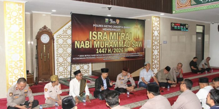 Jakarta Barat, LENSA POLRI – Dalam rangka memperingati Isra Mi’raj Nabi Muhammad SAW 1447 Hijriah/2026 Masehi, Polres Metro Jakarta Barat menggelar kegiatan sholat Dzuhur berjamaah yang dilanjutkan dengan tausiyah keagamaan, bertempat di Masjid Jami Al-Istiqomah Polres Metro Jakarta Barat, Kamis (22/1/2026).