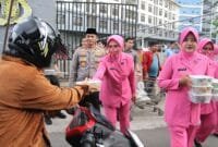 Jakarta Barat, Polres Metro Jakarta Barat bersama Bhayangkari Cabang Metro Jakarta Barat membagikan makanan takjil untuk berbuka puasa kepada pengendara sepeda motor dan mobil,…