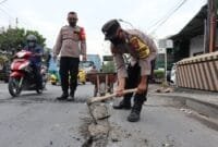 GRESIK – Anggota Polsek Manyar Polres Gresik menambal jalan berlubang di jembatan Desa Sukomulyo, Kecamatan Manyar, Kabupaten Gresik, Jumat (4/2/2022). Penambalan menggunakan material cor…