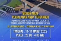 Demak – Pelaksana proyek tol Semarang-Demak akan memasang girder di atas jalan Pantura pada 11 hingga 14 Maret 2022. Pemasangan tersebut tepatnya berada di…