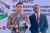 Karopenmas Divhumas Polri, Brigjen Pol. Ahmad Ramadhandi memberikan keterangan dalam press conference terkait pembukaan ASEAN Ministerial Meeting on Transnational Crime (AMMTC) ke-17 di Labuan…