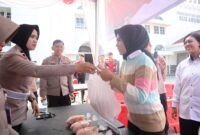 Kota Sukabumi- Sejumlah anggota Polwan dan pengurus Bhayangkari Cabang Sukabumi Kota menawarkan ayam potong frozen ke para pengendara dan pengemudi yang melintas di Jalan…