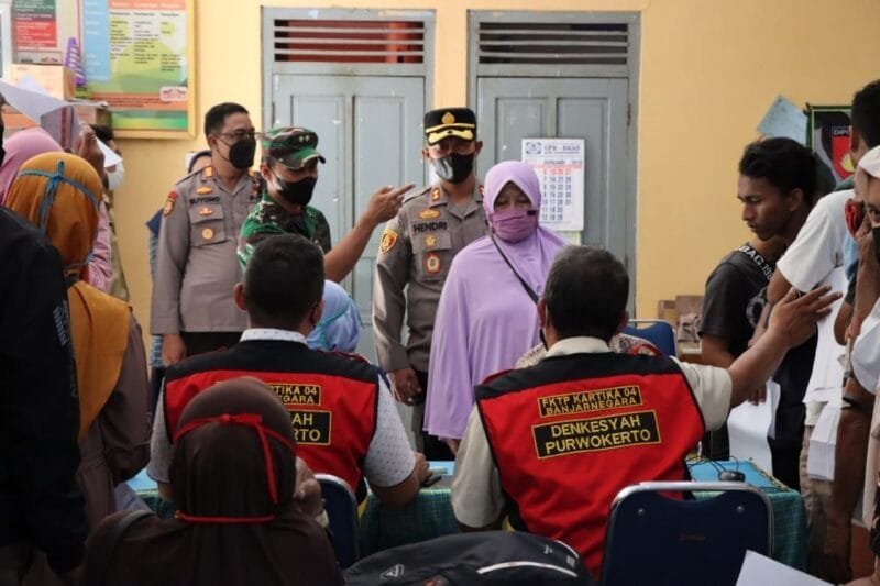Banjarnegara – Kapolres Banjarnegara AKBP Hendri Yulianto SIK, MH bersama Komandan Kodim 0704/Banjarnegara Letkol. Inf. Dhanang Agus Setiawan, SE mengecek pelaksanaan keroyok vaksin atau percepatan vaksinasi dosis satu, dua dan tiga di Kecamatan Susukan Banjarnegara, Sabtu (9/4/2022).