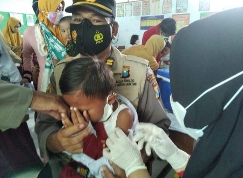 Bondowoso – Ada model trauma healing atau penyembuhan trauma unik yang dilakukan oleh polisi pada siswa yang sedang vaksinasi di Kabupaten Bondowoso.