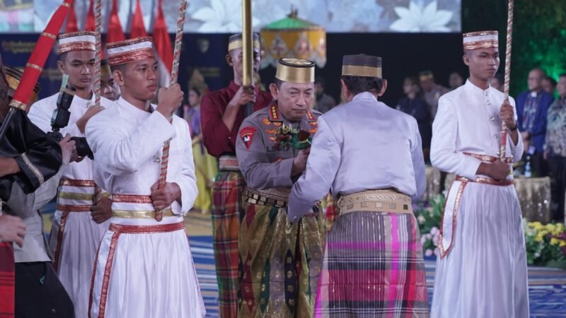 Kapolri Jenderal Listyo Sigit Prabowo dianugerahi gelar Raja atau Karaeng dan Pusaka Supakala dari Dewan Adat dan Kerajaan di Sulawesi Selatan (Sulsel). Penghargaan diberikan berbarengan dengan kegiatan pembukaan Rakernis Baharkam Polri, di Ballroom Hotel Four Points by Sheraton Makassar, Sulsel, Rabu (5/6/2024).
